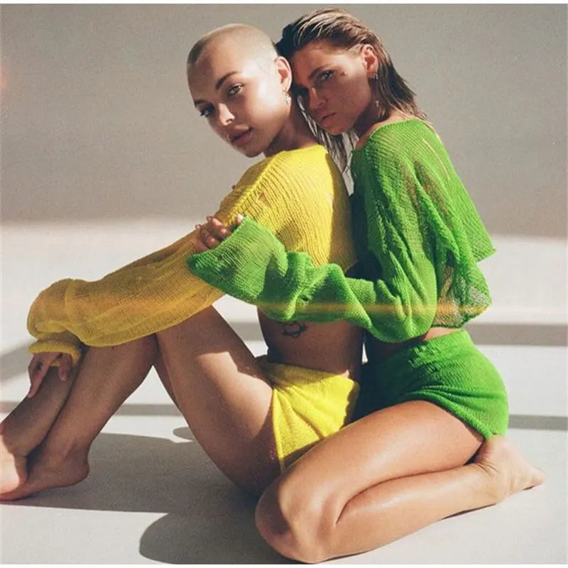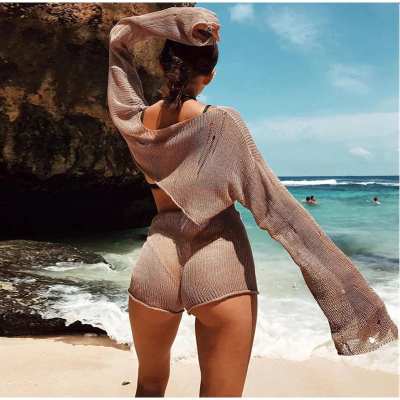 A women's beach crop top and shorts set that is light to help feel the wind and stay cool. This crop top and shorts comes with stylish holes and rips, and a mesh like knit.