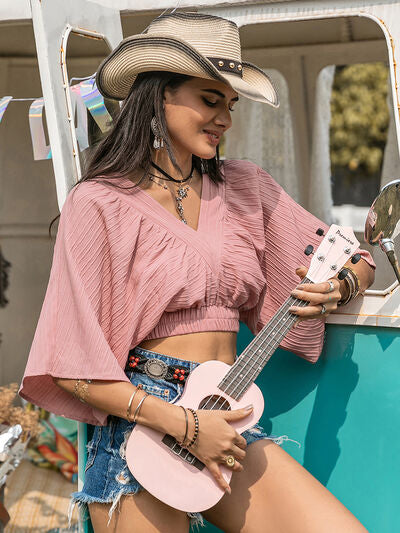 This Plain Women's V-Neck Bell Sleeves Crop Top offers a stylish and versatile addition to any wardrobe. The bell sleeves add a touch of elegance and the cropped length is perfect for pairing with high-waisted bottoms. The v-neckline adds a flattering touch and the plain design allows for easy pairing with any outfit. Elevate your fashion game with this must-have piece.