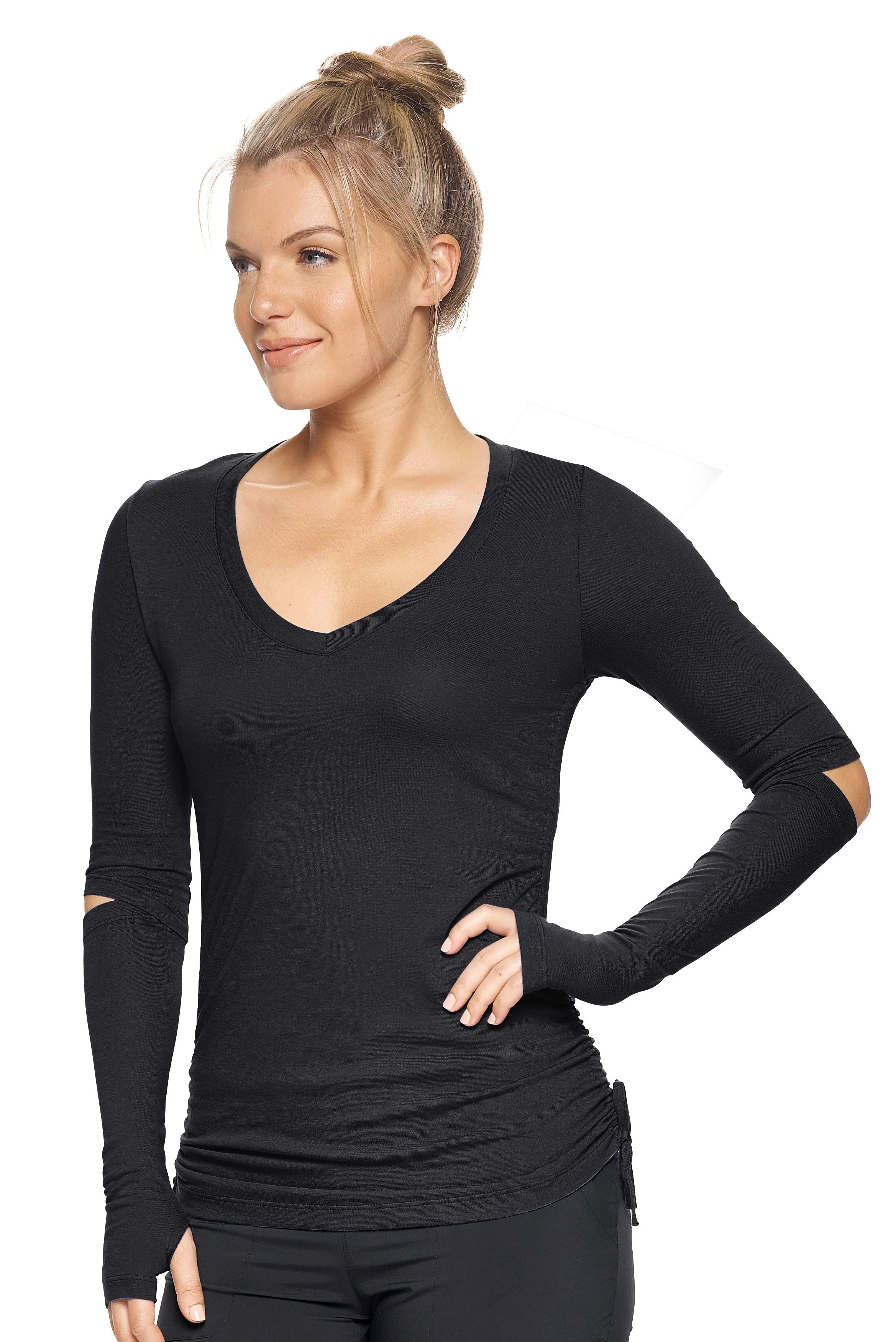 Expertly crafted with sustainable LENZING® Modal and ring-spun cotton, this women's V-neck shirt offers a luxuriously soft feel that's as elevated as it is eco-conscious. Featuring a modern feminine fit, adjustable side cinches, open elbow detail, and thumbholes, this shirt combines comfort and style. Made in the USA and gets even softer with each wash.