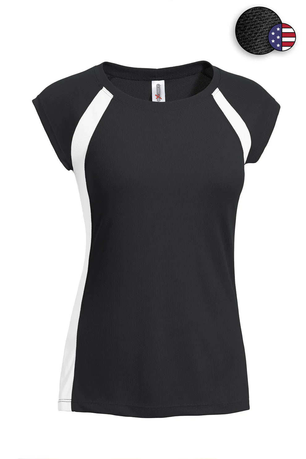 Stay cool and confident during your workouts with our Women's Raglan Stripe Sports Top. Trusted by professional athletes and the U.S. Armed Forces, this performance top features lightweight micro-mesh technology that wicks away sweat and controls odors. With a feminine fit, curved bottom hem, and self fabric bound collar, you'll stay comfortable and stylish. Made with 100% microfiber polyester in the USA.