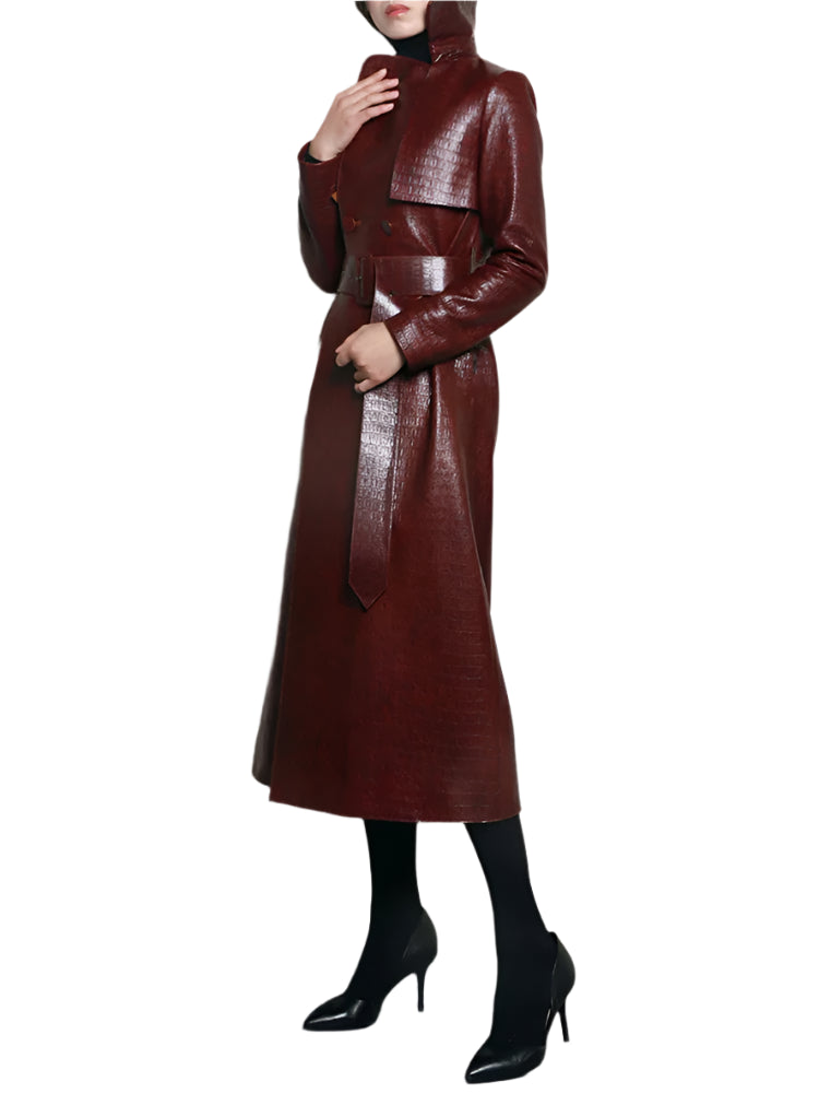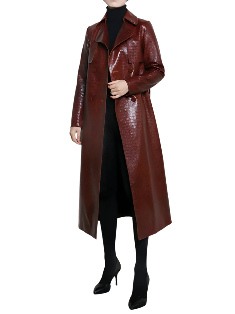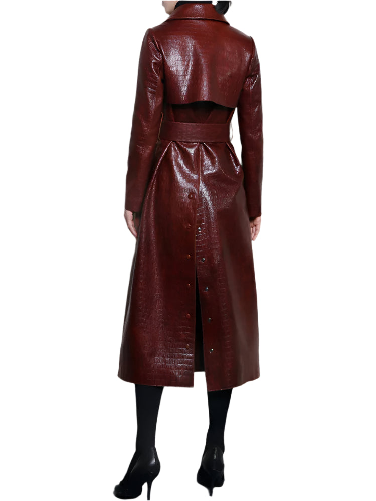 The only colors you need in this slick faux leather jacket: dark red and black. Styled with lengthy, sleek faux leather, and smooth appeal this long faux leather jacket is ready for any occasion. Great for winter or autumn conditions.